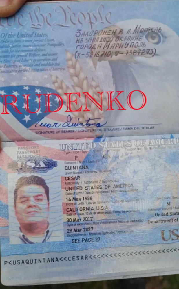 π·πΊπΊπΈπΊπ¦ A serviceman of the Russian Army with the call sign "Kerch" shows the passport of a killed mercenary (Cesar Quintana) from the United States, who fought on the side of the nationalists in Mariupol.