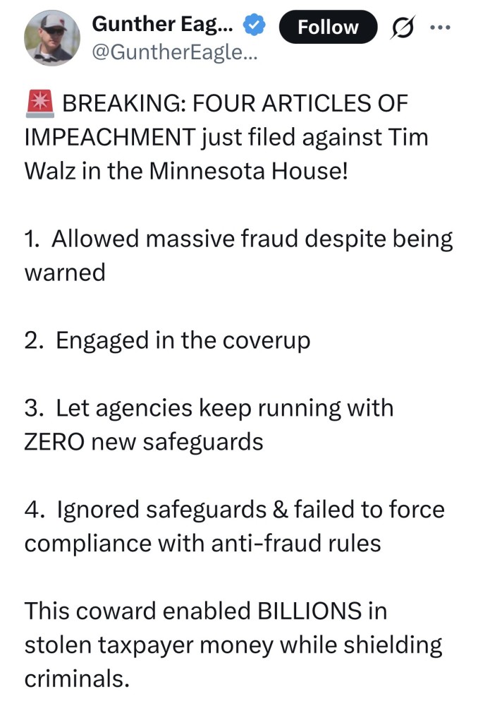 Articles of Impeachment filed against Tim Walz. From VP nominee to being a soon to be impeached Governor in 14 months.