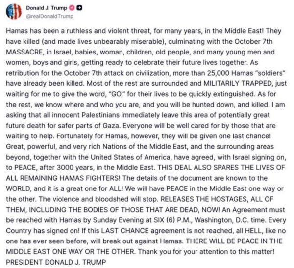 Great, powerful, and very rich Nations of the Middle East, and the surrounding areas beyond, together with the United States of America, have agreed, with Israel signing on, to PEACE, after 3000 years, in the Middle East. THIS DEAL ALSO SPARES THE LIVES OF ALL REMAINING HAMAS FIGHTERS! The details of the document are known to the WORLD, and it is a great one for ALL! We will have PEACE in the Middle East one way or the other. The violence and bloodshed will stop. RELEASES THE HOSTAGES, ALL OF THEM, INCLUDING THE BODIES OF THOSE THAT ARE DEAD, NOW! An Agreement must be reached with Hamas by Sunday Evening at SIX (6) P.M., Washington, D.C. time. Every Country has signed on! If this LAST CHANCE agreement is not reached, all HELL, like no one has ever seen before, will break out against Hamas. THERE WILL BE PEACE IN THE MIDDLE EAST ONE WAY OR THE OTHER. Thank you for your attention to this matter!